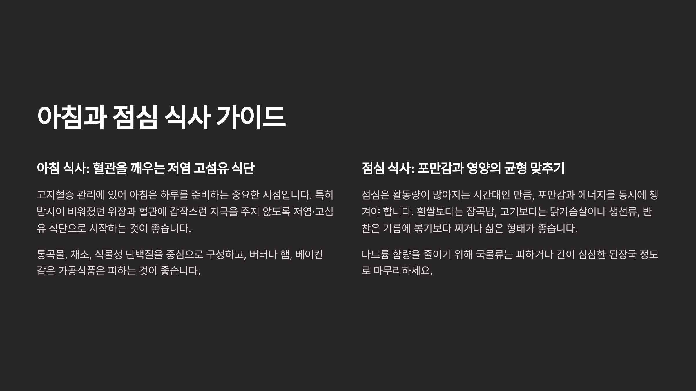 고지혈증 관리에 있어 아침은 하루를 준비하는 중요한 시점이에요. 특히 밤사이 비워졌던 위장과 혈관에 갑작스런 자극을 주지 않도록 저염·고섬유 식단으로 시작하는 것이 좋아요. 통곡물, 채소, 식물성 단백질을 중심으로 구성해 보세요. 버터나 햄, 베이컨 같은 가공식품은 피하는 게 좋습니다.