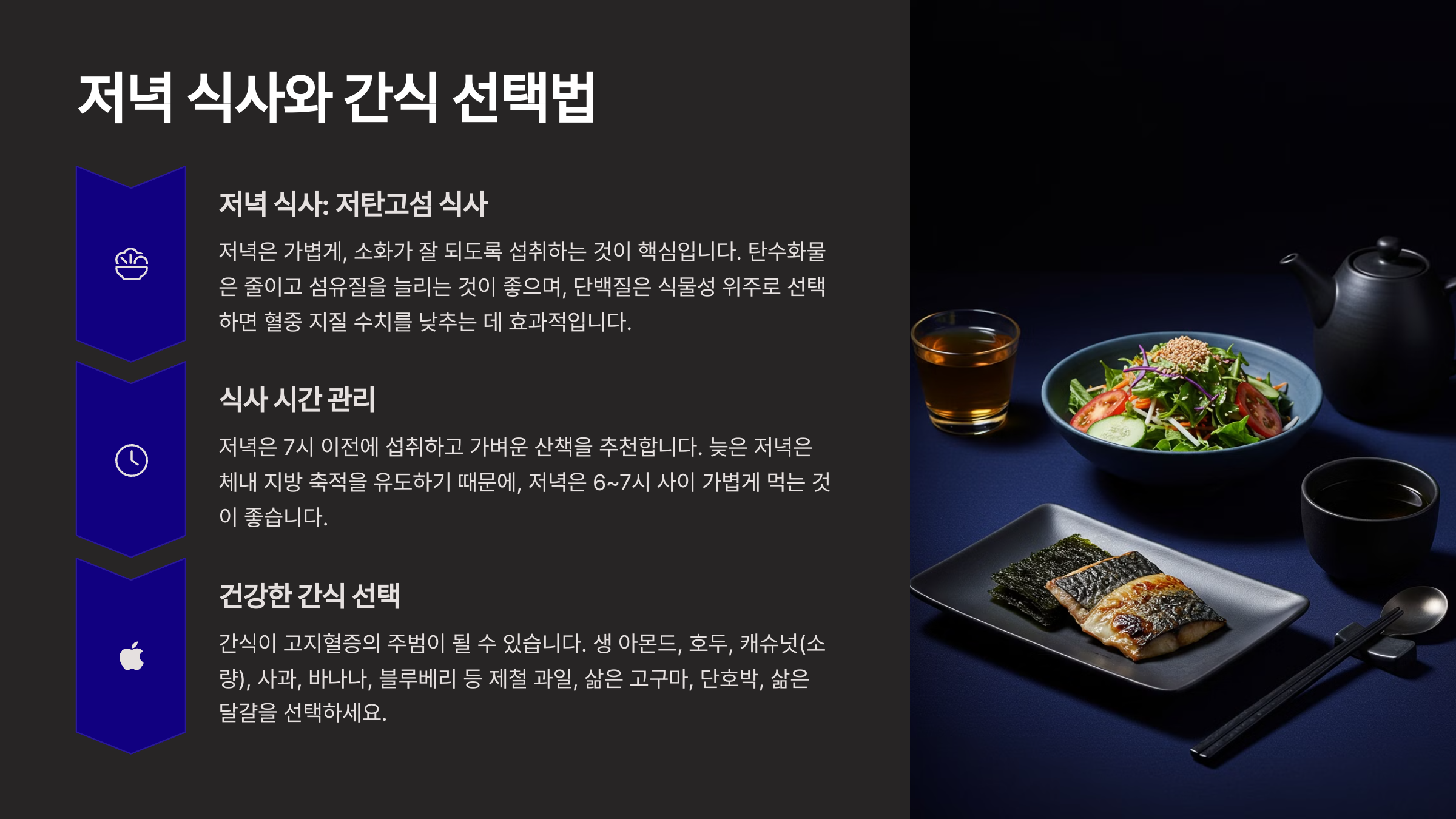 저녁은 가볍게, 소화가 잘 되도록 섭취하는 것이 핵심입니다. 탄수화물은 줄이고 섬유질을 늘리는 것이 좋으며, 단백질은 식물성 위주로 선택하면 혈중 지질 수치를 낮추는 데 효과적이에요. 생채소, 해조류, 삶은 콩류를 섭취하고, 밤 늦은 시간 간식은 피해주세요.