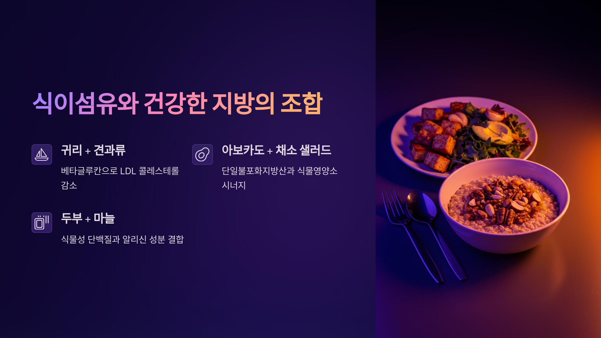 베타글루칸이 풍부한 귀리와 오메가-3가 많은 연어, 견과류가 대표적입니다. 여러 식품을 조합해 섭취하는 것이 더 중요합니다.