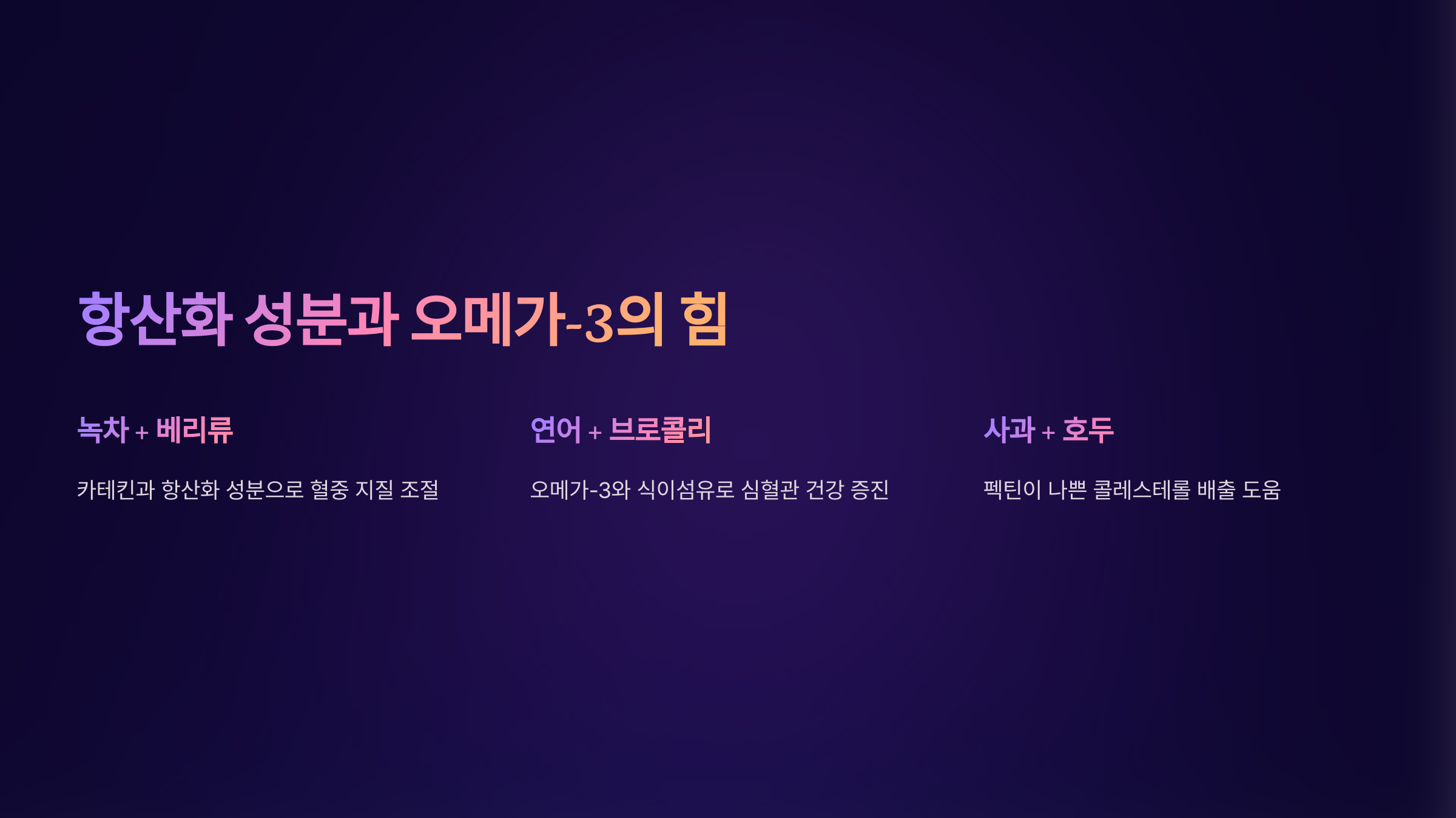 콜레스테롤을 낮추는 데 있어 항산화는 굉장히 중요한 요소예요. 녹차에 풍부한 카테킨은 혈중 지질을 조절하고, 블루베리나 라즈베리 같은 베리류는 염증을 줄이며 HDL 콜레스테롤(좋은 콜레스테롤)을 증가시키는 데 도움을 줘요. 오후 간식으로 녹차와 함께 냉동 베리를 한 줌 곁들여보세요.