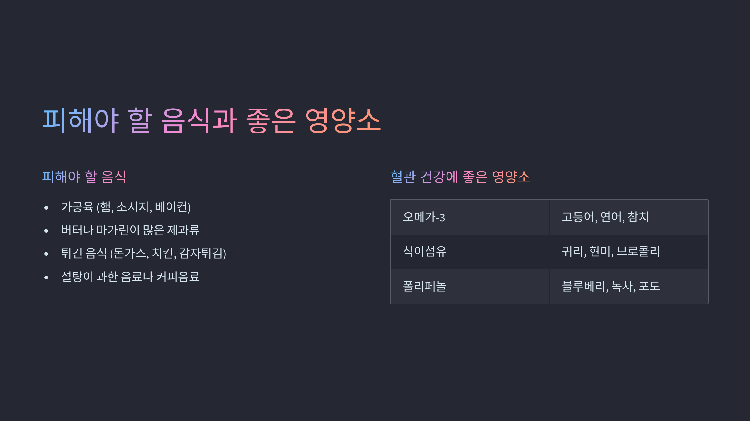 | 오메가-3 | HDL 증가, 중성지방 감소 | 고등어, 연어, 참치 |