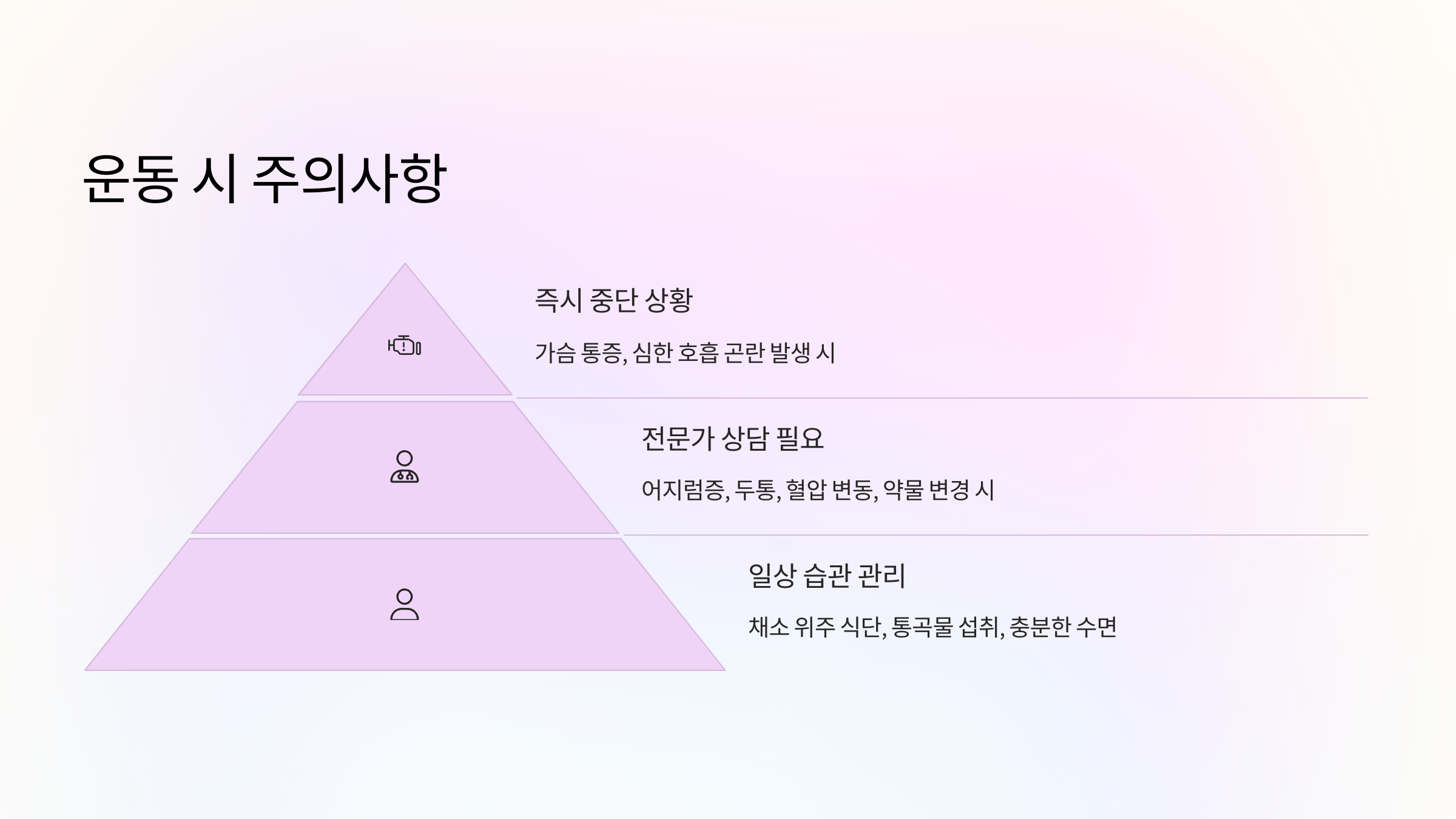 - 운동 중 가슴 통증이나 심한 호흡 곤란 발생 시