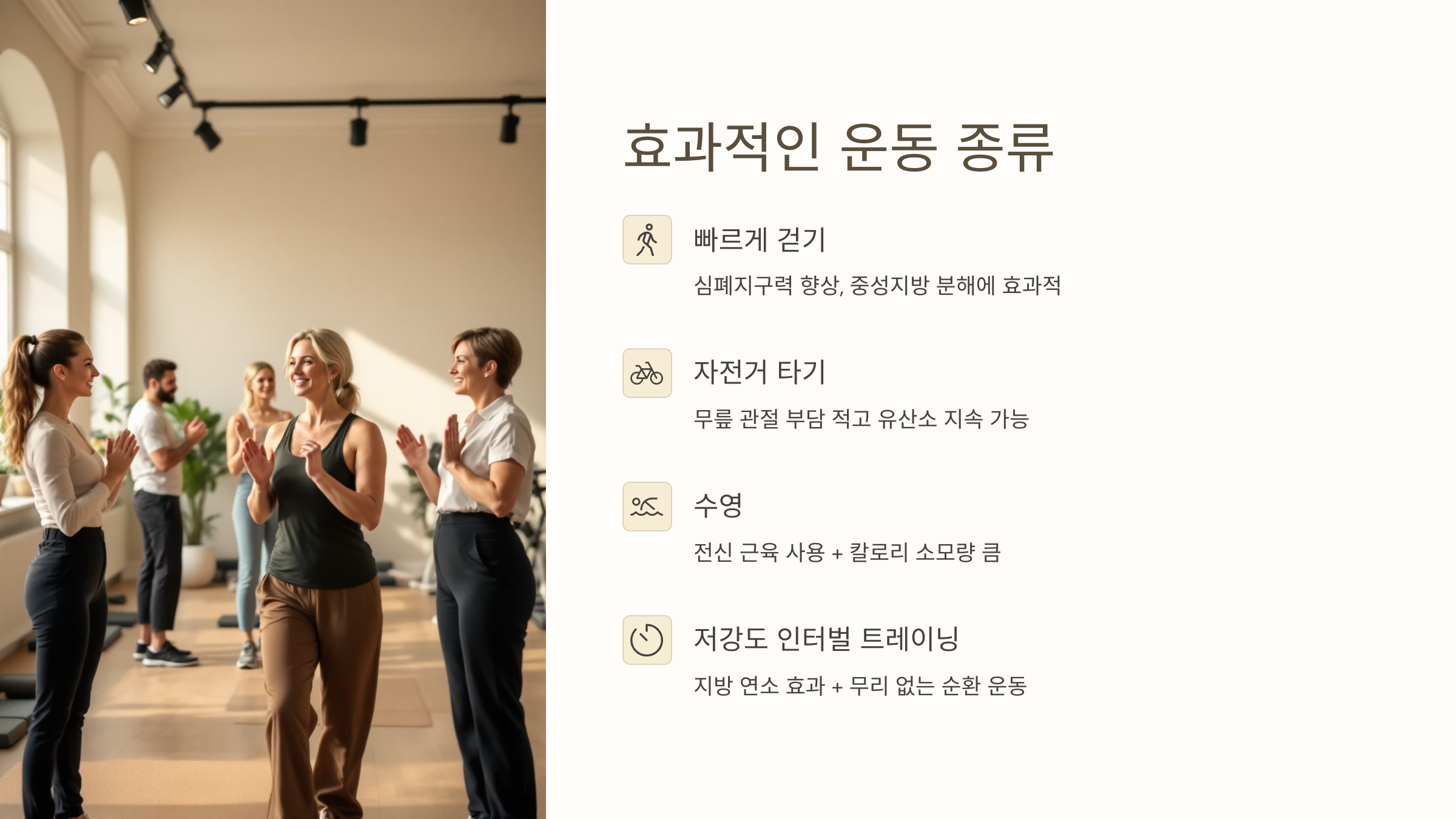| 저강도 인터벌 트레이닝 | 지방 연소 효과 + 무리 없는 순환 운동 |