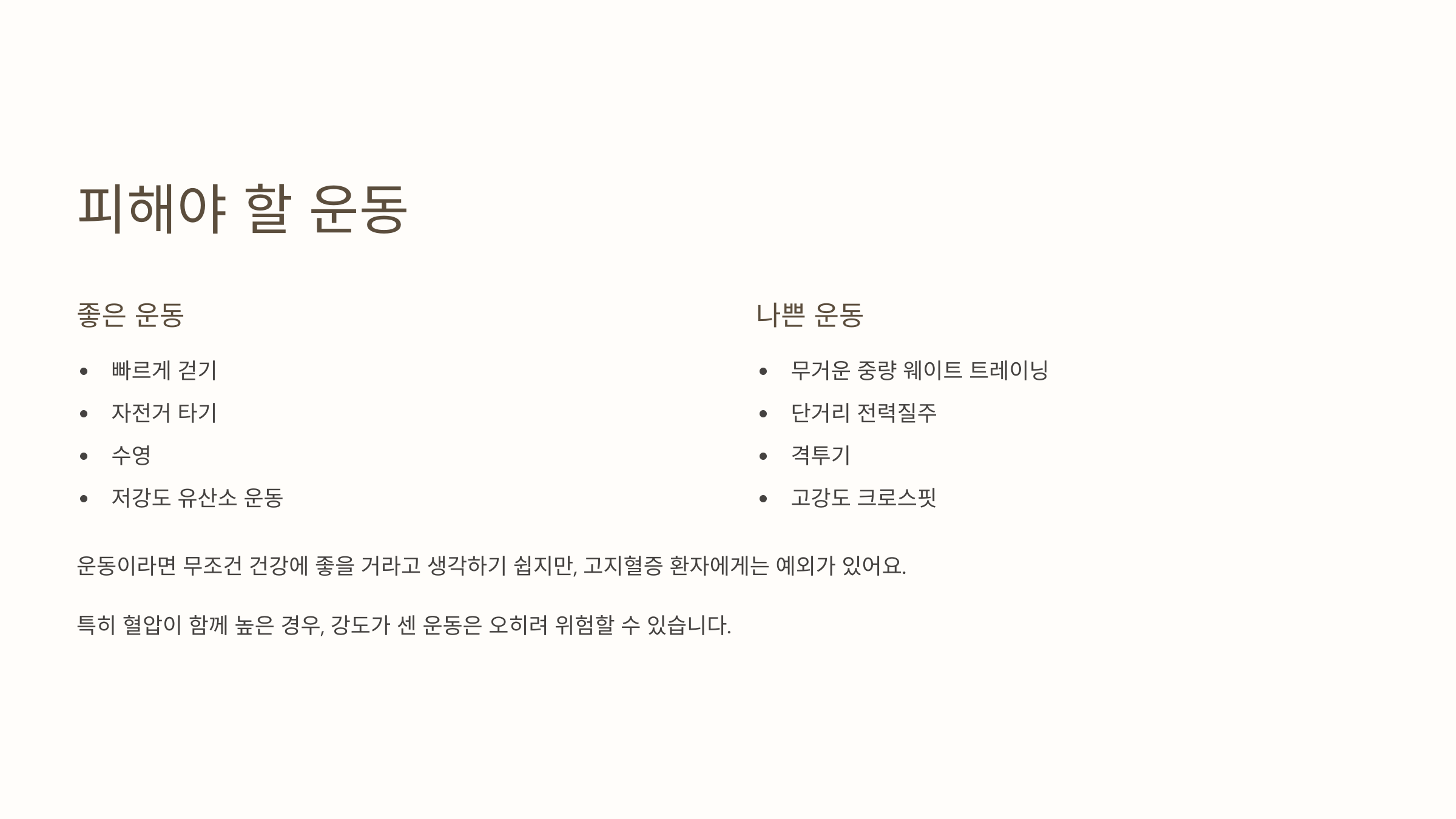 | 지속 가능한 저강도 유산소 | 순간 강도 높은 인터벌, 무리한 등산 |