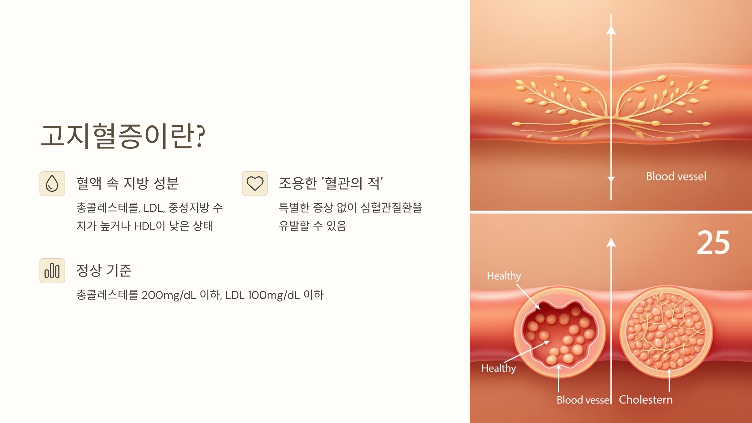 고지혈증은 혈액 속 지방 성분, 특히 총콜레스테롤, LDL(나쁜 콜레스테롤), 중성지방 수치가 높거나 HDL(좋은 콜레스테롤)이 낮은 상태를 말합니다. 조용한 ‘혈관의 적’이라고 불릴 만큼, 특별한 증상 없이 심혈관질환을 유발할 수 있어 조기 관리가 중요해요.