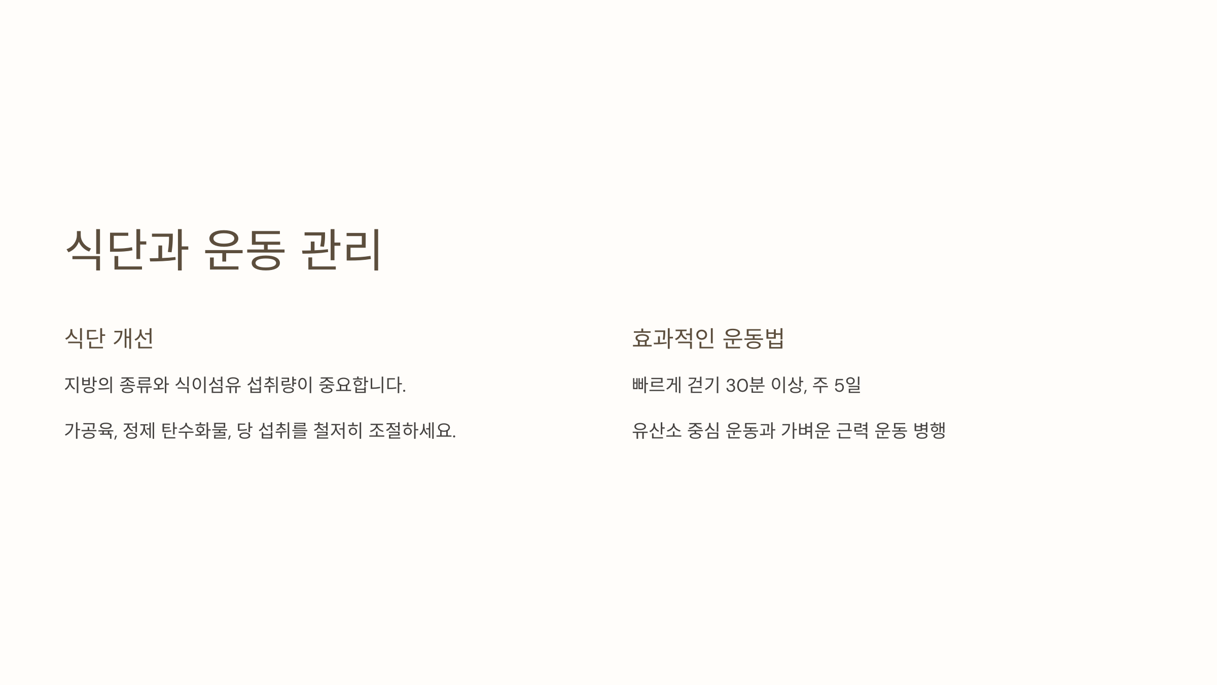 | 운동 | 주 150분 이상 유산소 운동 | 무리한 고강도 운동은 지양 |