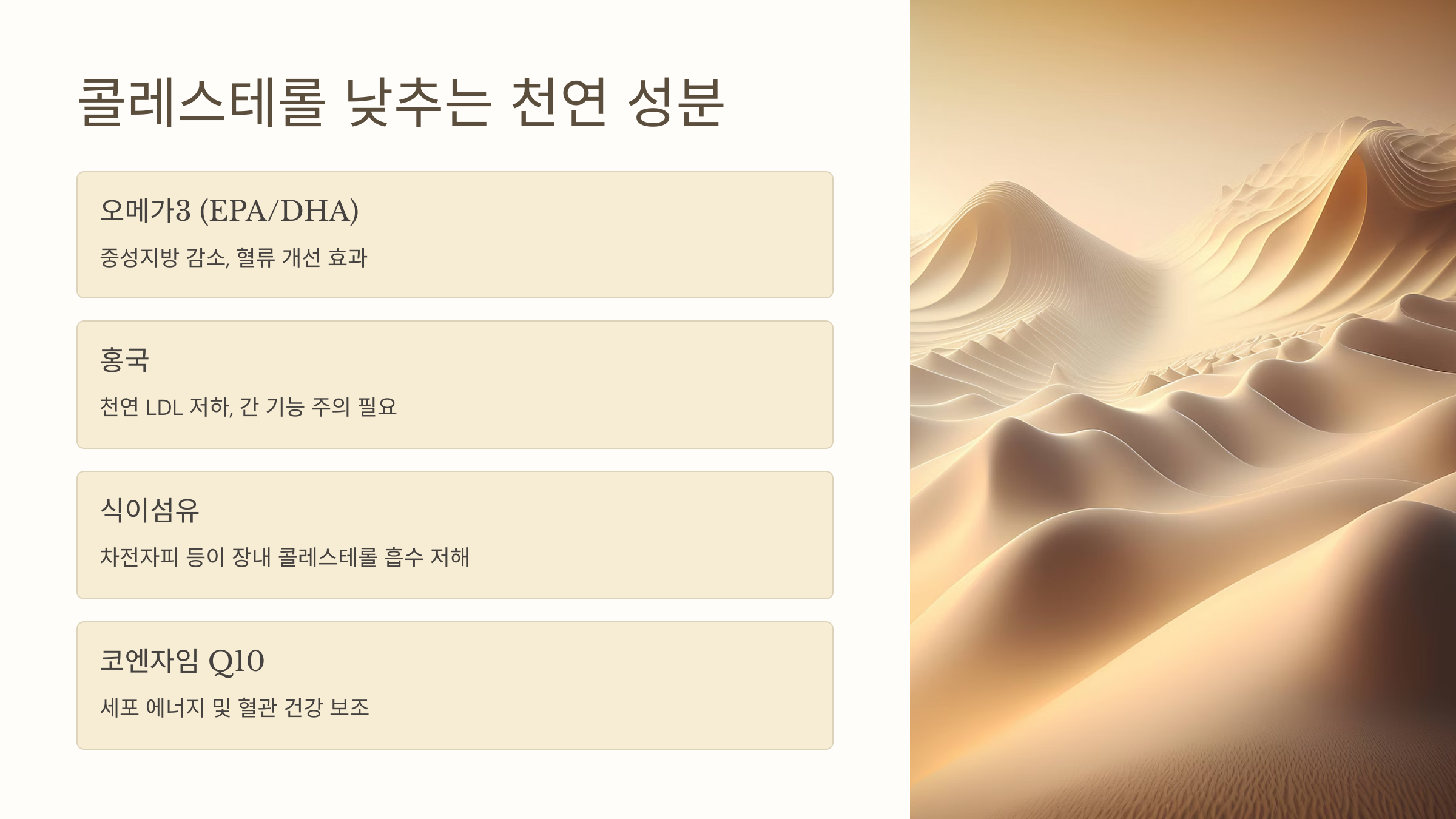 - 식이섬유(차전자피 등) – 장내 콜레스테롤 흡수 저해
