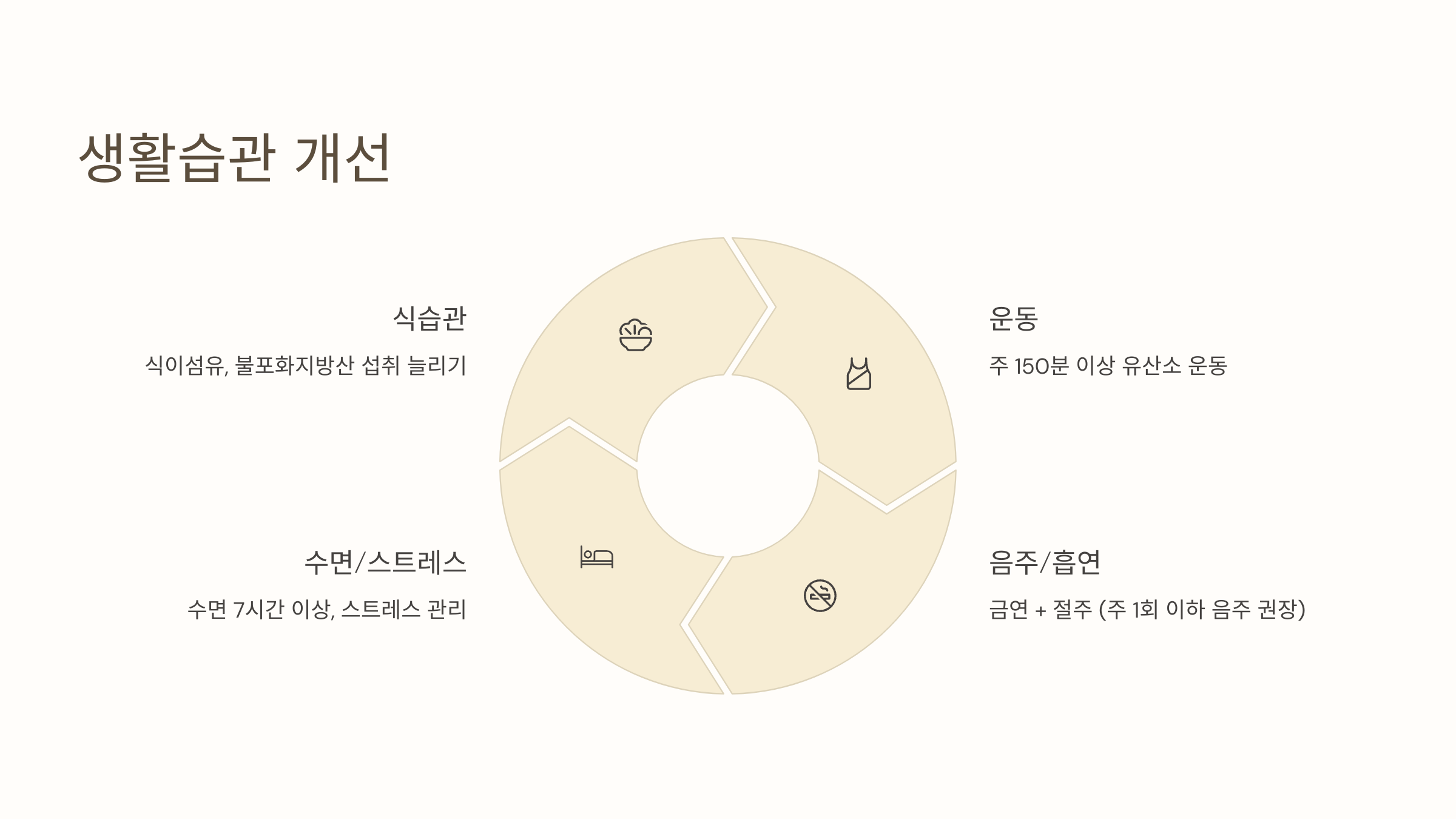 | 식습관 | 식이섬유, 불포화지방산 섭취 늘리기 | 튀김, 가공육, 트랜스지방 줄이기 |