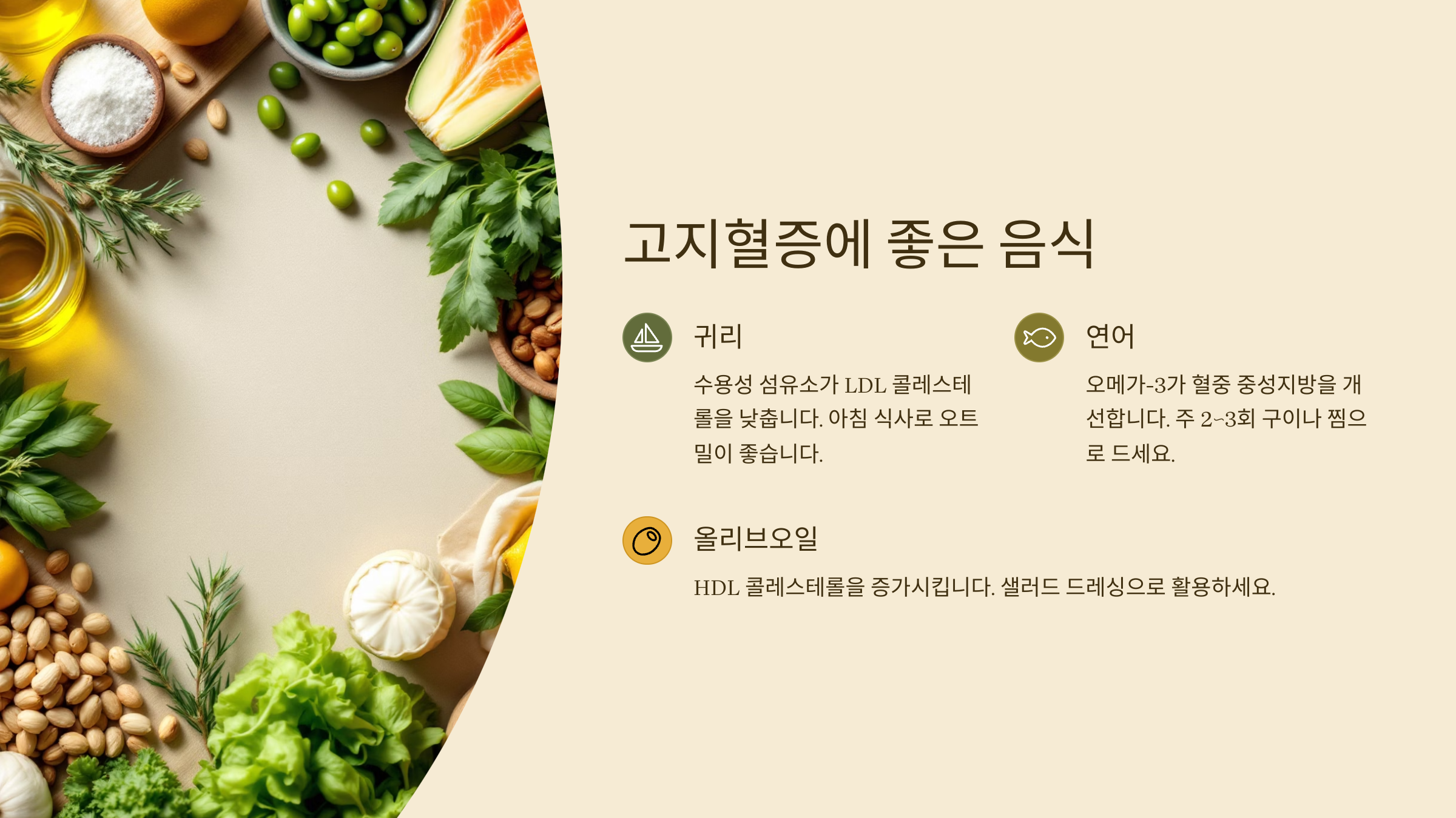 | 올리브오일 | HDL 콜레스테롤 증가 | 샐러드 드레싱으로 활용 |