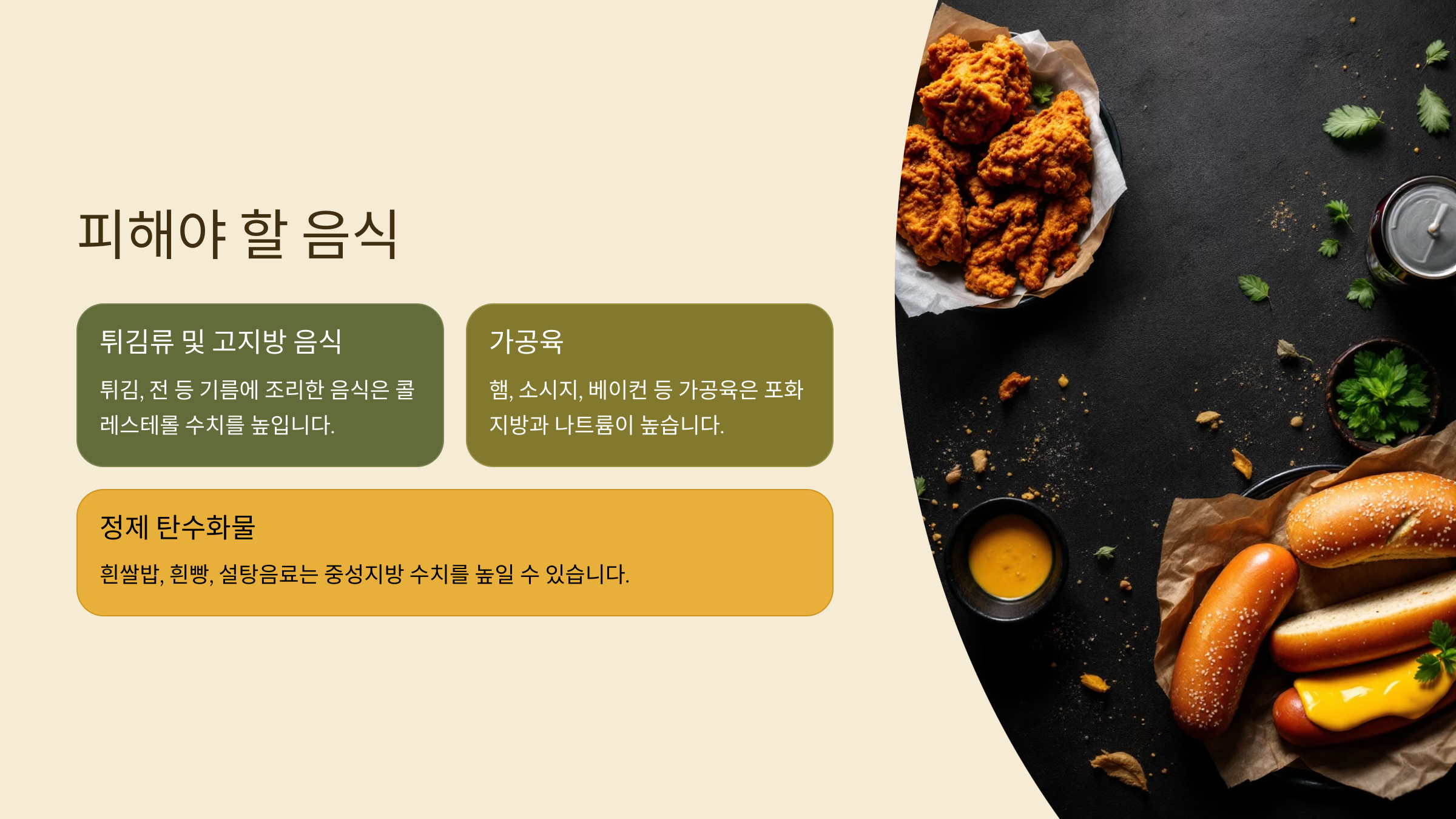 좋은 음식도 중요하지만, 나쁜 음식 피하는 게 더 중요할 때도 있어요. 아래 항목은 고지혈증 관리에 있어 반드시 피해야 할 식품들입니다.