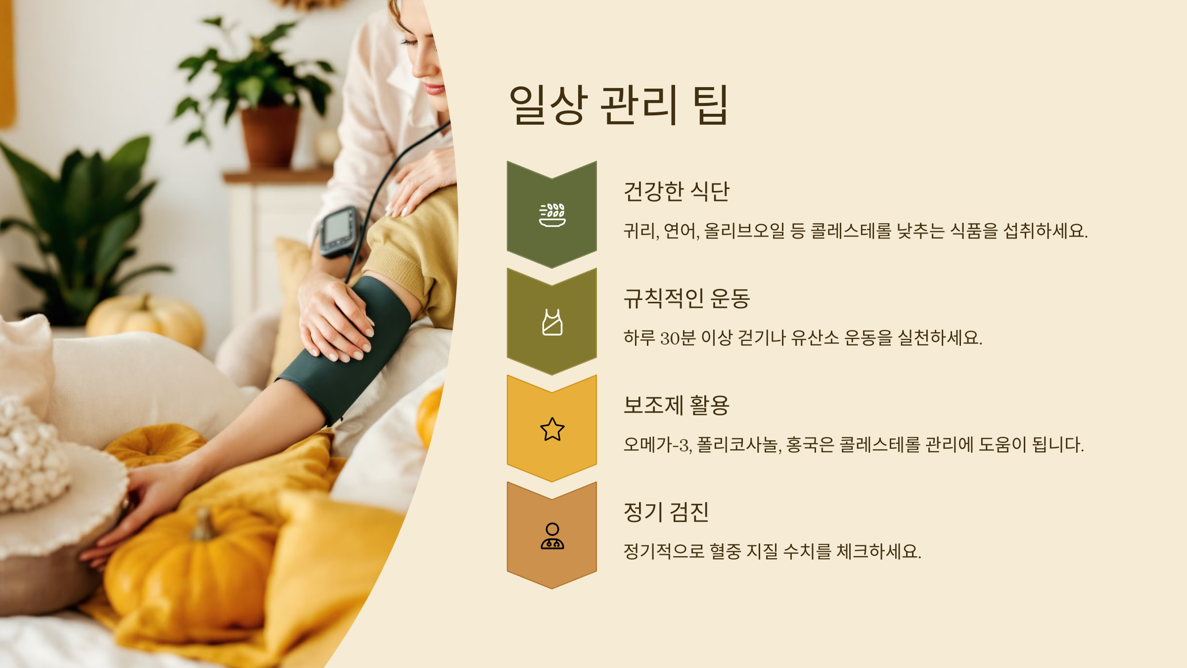 - 정기적으로 혈중 지질 수치 체크하기