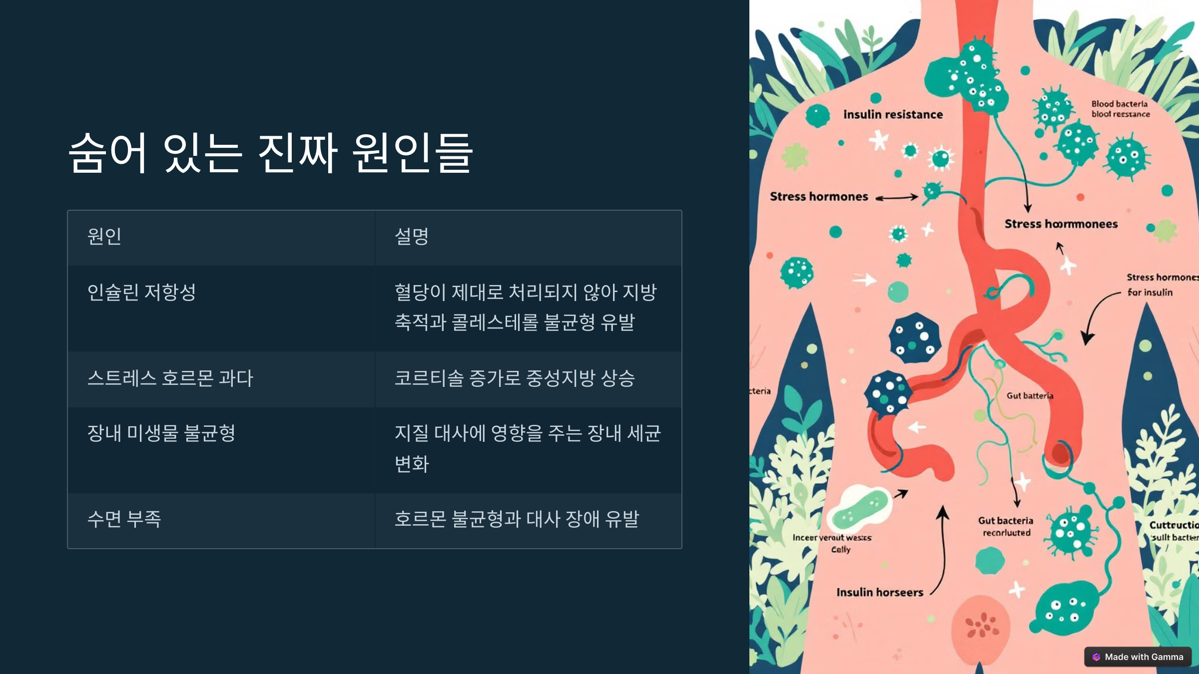| 인슐린 저항성 | 혈당이 제대로 처리되지 않아 지방 축적과 콜레스테롤 불균형 유발 |