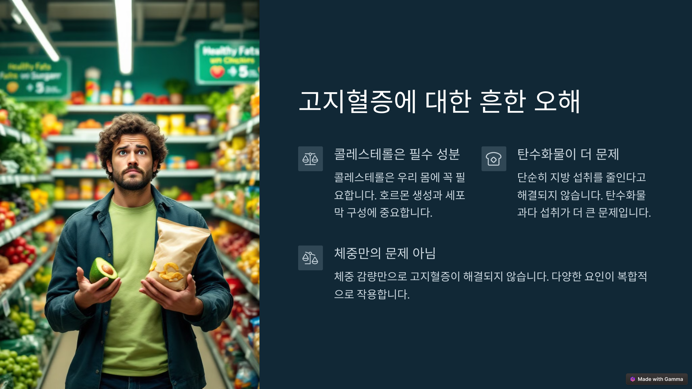 '지방 줄이기'만이 고지혈증의 해법일까요? 그보다 더 중요한 건 혈당 조절이에요. 고탄수화물 식단은 인슐린 분비를 자극해 지방 합성을 유도하거든요. 또 가공된 식품에 숨겨진 설탕과 트랜스지방이 문제죠. 식단을 바꿀 땐 반드시 '질 좋은 단백질'과 '좋은 지방'을 충분히 섭취하는 게 핵심입니다.