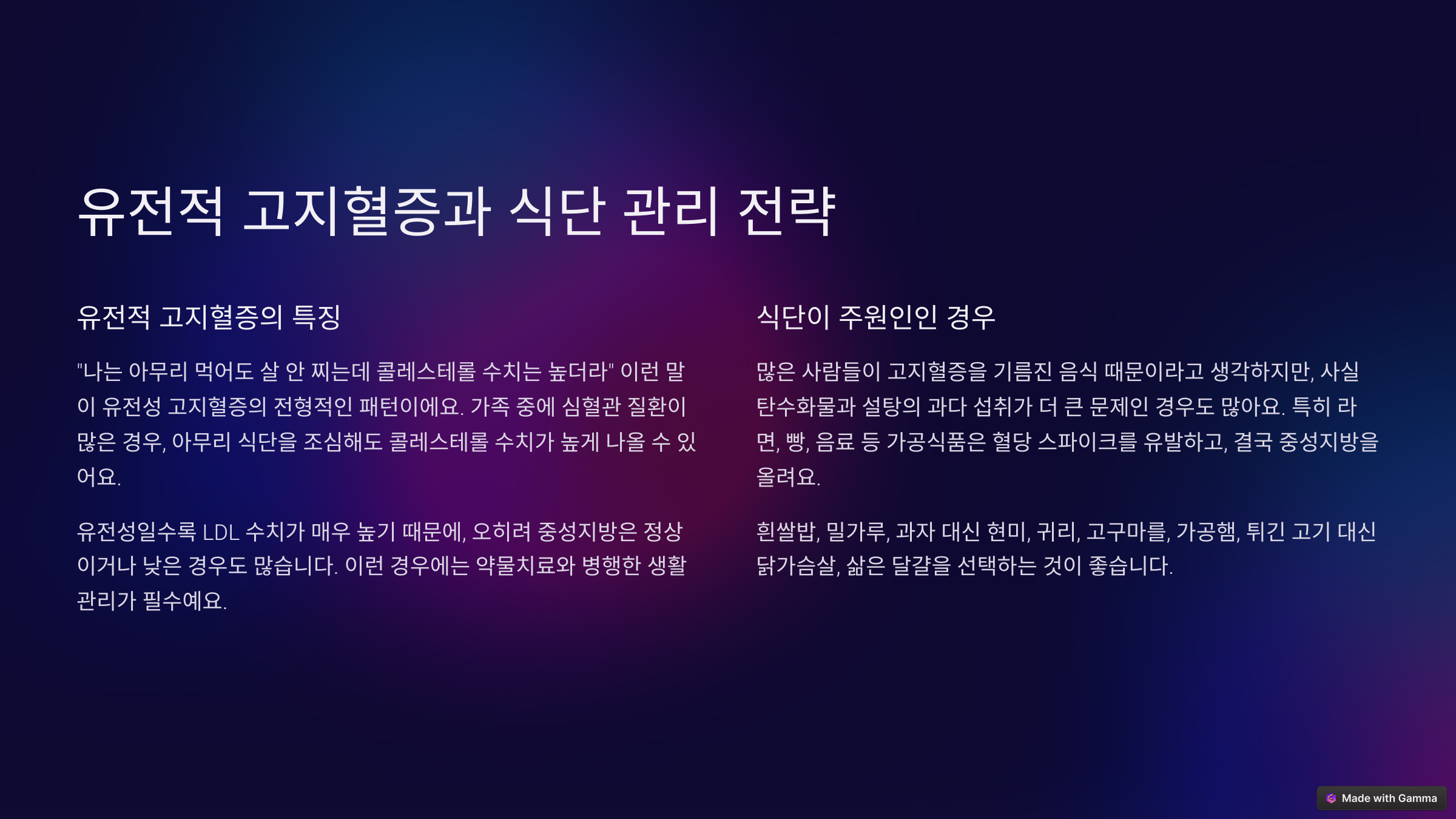 | 유전성 고지혈증 | 지방 제한 + 오메가3 보충 + 약물 병행 |
