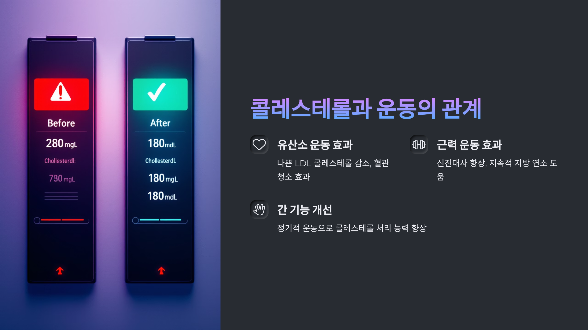 안녕하세요! 요즘 건강검진 결과에서 '콜레스테롤 수치 경계'라는 말을 듣고 깜짝 놀라셨다면 저랑 같은 고민을 하고 계시겠네요. 저도 직장생활하며 스트레스, 배달음식에 의존하다 보니 콜레스테롤 수치가 올라가더라고요. 그래서 여러 전문가의 조언을 바탕으로 유산소와 근력운동을 병행하는 방식으로 운동 루틴을 바꿔봤습니다. 이 글에서는 실제로 콜레스테롤 수치를 낮추는 데 효과가 있다고 입증된 운동 조합을 알려드릴게요. 실천할 수 있게 구성했으니 끝까지 함께해요!
