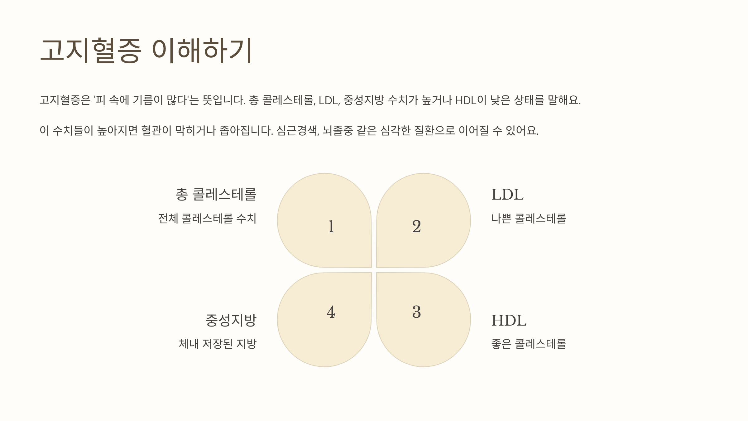 고지혈증은 말 그대로 ‘피 속에 기름이 많다’는 뜻이에요. 구체적으로는 총 콜레스테롤, LDL(나쁜 콜레스테롤), 중성지방 수치가 높거나, HDL(좋은 콜레스테롤)이 낮은 상태를 말합니다. 문제는 이 수치들이 높아질수록 혈관이 막히거나 좁아지면서 심근경색, 뇌졸중 같은 심각한 질환으로 이어질 수 있다는 점이죠.